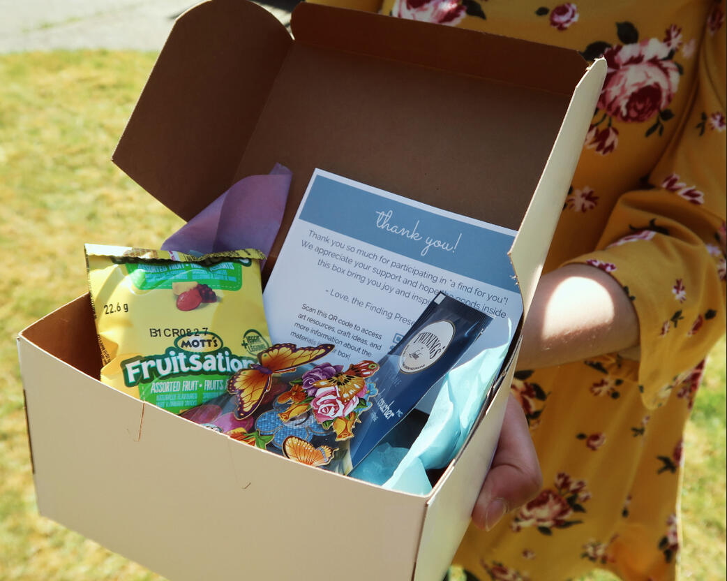 When we were first thinking of Finding Present, the original idea was just to produce boxes with cool items that would help people destress. It was only later, as we were doing more brainstorming, that the other elements came into play. As a result, giving people our first boxes felt particularly exciting.Our first art boxes were made and given to a cohort of artistic youth in November 2020. Each box featured an assortment of small gifts designed to spark creativity, including a crocheted stuffed animal, a mini canvas, curated art resources, and a handmade notebook. We also included some Asian snacks because we like food :) The overall design and box-making process was special because each person used their artistic skills and talent to make something for the box. It was truly a product of collaboration. We were touched by the excitement and enthusiasm of the recipients, which inspired us to continue refining our “Art Box” idea to make it even better!